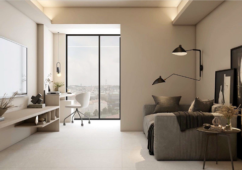 The exposed beams are thoughtfully incorporated into the design, turning them from a visual obstacle into an interior architectural charm while enhancing the modern minimalism that flows around the space.