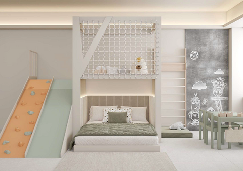 The master suite serves as a serene sanctuary with natural tones and materials that promote relaxation and comfort - A perfect escape from daily routines. In the children´s bedroom, the design mirrors the home´s modern rythm while creating a playful, inspiring environment for both study and play. A cosy, storybook-inspired bed makes bedtime magical, blending comfort with imagination to create a warm and inviting space for rest and creativity.